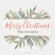 Holiday Sticker features a hand painted watercolor frame, holly branches with red berries, pines and winter foliage design.