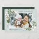 Elegant botanical holiday photo cards put your favourite horizontal or landscape orientated photo front and centre, accented by green botanical sprigs, foliage, leaves and white lily of the valley flowers, on a pale sage green background. Add your custom Christmas greeting (shown with "merry everything"), your names, and the year. Personalise the reverse side with two additional photos on a contrasting deep hunter green background. An elegant and festive holiday photo card that's sure to please everyone on your Christmas card list this season!