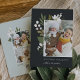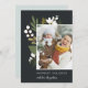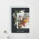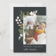Elegant botanical holiday photo card features your favourite vertical photo, aligned at the right for a modern look and flanked by green botanical sprigs, foliage, leaves and white lily of the valley flowers, on a rich charcoal off-black background. Add your custom Christmas greeting (shown with "season's greetings"), your names, and the year. Personalise the reverse side with two additional photos on a contrasting pastel sage green background. An elegant and festive holiday photo card that's sure to please everyone on your Christmas card list this season!