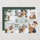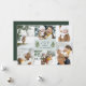 Elegant botanical holiday photo card features six of your favorite photos in a geometric collage layout. "JOY" or your short custom holiday greeting appears in the center, flanked by two green olive branches on a pale sage background. Personalize with your names, and add an additional photo to the back, along with the year.