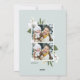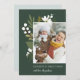Elegant botanical holiday photo card features your favourite vertical photo, aligned at the right for a modern look and flanked by green botanical sprigs, foliage, leaves and white lily of the valley flowers, on a rich hunter green background. Add your custom Christmas greeting (shown with "merry and blessed"), your names, and the year. Personalise the reverse side with two additional photos on a contrasting pastel sage green background. An elegant and festive holiday photo card that's sure to please everyone on your Christmas card list this season!