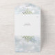 All in one wedding invitation featuring elegant botanical watercolor greenery leaves and a chic gold frame border on a winter snowflakes background. The invitation includes a perforated RSVP card with your wedding site QR code and details. Designed by Thisisnotme©