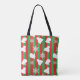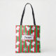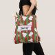 Personalised Cute holiday bag with white snowflakes, red and green stripes,, white mittens and winter hats.