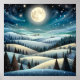 A serene winter landscape unfolds under the glow of a full moon, with rolling hills blanketed in snow and dotted with dark evergreen trees. Stars twinkle in the deep night sky, adding a magical touch to the peaceful scene. This fantasy landscape features a full moon illuminating a countryside covered in winter snow, with hills, trees and a star filled sky.