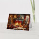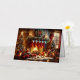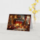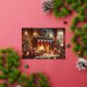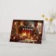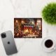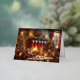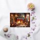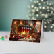 A lovely watercolor image of a cosy Christmas scene inside a room. There is a lit fireplace with stockings hanging above it, a decorated Christmas tree to the left, and a window showing it’s snowing outside. Various Christmas decorations and gifts are scattered on the floor, creating a warm and festive atmosphere.