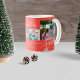 Modern elegant Christmas simple winter holiday family four photo collage mug featuring Together (editable) script lettering with white snowflakes over a rusty red background. +++++++++++++++ Personalise it with your family pictures, name, and text!