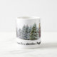 This winter season mug features snow-covered forest trees in the background and the text " Winter is not a season it's a celebration. Happy Winter Solstice. Use the mug for your celebration and throughout the winter season.