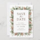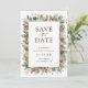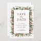 This elegant winter save the date announcement card features hand-painted watercolor greenery and pinecones arranged as a beautiful wreath. The text is brown and the background is white. The back includes a stylish bouquet. Find matching items in the Pinecone and Greenery Christmas Holiday collection.