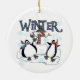 Two penguins and a snowman ice skate and text reads "Winter" on a keepsake ornament that's perfect for anyone who loves penguins and snowmen!
