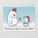 A cute Christmas cartoon where polar bear who is holding a iced mug complains to blue penguin. The caption "What does it take to get hot coffee around here?" The funny troubles of staying at the cold north pole - no hot coffee!!! The two characters look absolutely adorable with their Christmas caps. Also, did you notice the trees in the snow background? A cheerful and humourous Christmas design for friends, family and coffee lovers! Design by Rusty Doodle.