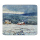 This design features a painting by the American Impressionist painter Childe Hassam (1859–1935). It shows a snowy landscape in the rural hills of Connecticut. The hills and sky are colored in various shades of blue. There are two farmhouses at the base of the hills: one of the houses is made out of light wood and the other is made out of dark red wood. Trees surround the farmhouses. The ground is covered with white snow. The original artwork was painted in 1906.