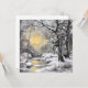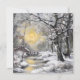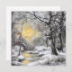 Snowy winter forest painting capturing a sunset moment with a water spring crossing the white ground, a house, and a deer hiding behind a tree.