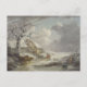 A winter landscape depicts a snow-covered countryside with barren trees and a thatched cottage. People are engaged in activities around a frozen pond, while horses stand nearby under a cloudy sky.