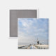 Souvenir photo magnet with a minimalistic view on a winter landscape in Holland with a path and a canal towards a windmill under a layer of snow with nice clouds at sunrise in the dutch countryside.