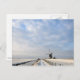 Photo postcard of a minimalistic view on a winter landscape in Holland with a path and a canal towards a windmill under a layer of snow with nice clouds at sunrise in the dutch countryside.