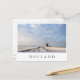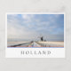 Photo postcard of a minimalistic view on a winter landscape in Holland with a path and a canal towards a windmill under a layer of snow with nice clouds at sunrise in the dutch countryside with a white border and in a white box the text 'Holland' and with stripes in the colors red, white and blue, the colors of the dutch flag.
