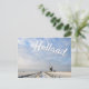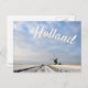 Photo postcard of a minimalistic view on a winter landscape in Holland with a path and a canal towards a windmill under a layer of snow with nice clouds at sunrise in the dutch countryside with the text 'Holland'.