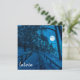 Winter landscape with snow covered pine and fir trees in a moonlight at starry night with full moon. View of coniferous forest with wooden pathway near sea coast with beautiful night sky with stars