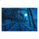 Winter landscape with snow covered pine and fir trees in a moonlight at starry night with full moon. View of coniferous forest with wooden pathway near sea coast with beautiful night sky with stars