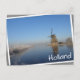 Postcard of a landscape in the countryside in the Netherlands in winter with a windmill, ice on the river and frosted reeds under a clear blue sky with a white edge and in white the text 'Holland'. The image is a bit rotated to create the illusion of it laying loose.