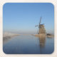 Coaster with a landscape in the countryside in the Netherlands in winter with a windmill, ice on the river and frosted reeds under a clear blue sky.