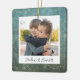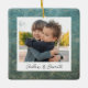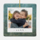 A sweet double sided photo ornament displaying a favorite photo on each side, on a dusty teal watercolor background dotted with string lights. Personalize with a custom caption on the front in handwritten lettering, and add the year to the back.
