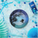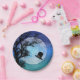 Plates with full moon on a starry night with the silhouette of a tree and a top hat with magical snowflakes.