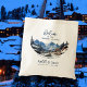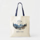 Wedding welcome bags to personalise for a mountain wedding event. Fabric bags with dark blue handle (or change the colour), have a winter mountain scene and many lines of dark blue text to customise. Say, "Welcome" to guests with a useful wedding favour. A road leads through snow covered rocks and misty blue mountains in this image which has a curved lower edge. Curved text beneath the image is for the location of the event. Names of the couple and date are at the bottom, with more text at the top. All wording can be removed, or changed, as needed. The back of the bag is blank.
