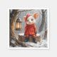 A cute mouse dressed in a warm red outfit sits on a tree stump surrounded by a snowy forest