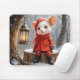 A cute mouse dressed in a warm red outfit sits on a tree stump surrounded by a snowy forest