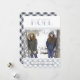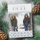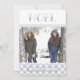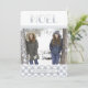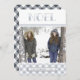 Our Winter Noel holiday photo card sports rustic style in wintry hues of silver grey, crisp white, and smoky navy blue with a hint of charcoal. Design features "NOEL" at the top in decorative lettering with a bottom border of buffalo plaid in icy blue grey and white. Personalise with your family name at the year across the bottom on a ribbon banner.