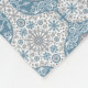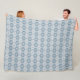 Wintry fleece blanket with an ogee pattern of snowflakes, swirls, and vintage inspired ornaments in silvery grey, blue, and white.