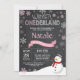 Winter Onederland 1st Birthday Invitation. Snowman. Pink and White Snowflake. First Birthday. Girl 1st Bday Invite. Chalkboard Background. Black and White. For further customisation, please click the "Customise it" button and use our design tool to modify this template.
