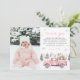 A snowy woodland thank you card featuring a vintage truck, snowy evergreens, and woodland animals — a sweet way to share your favorite birthday photo and gratitude.