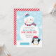 Winter wonderland "ONEderland" first birthday party invitation design features a happy snowman wearing a hat and scarf and a cute arctic penguin with Santa hat and number "1" on his tummy waving and pulling a sled in the snow. The background has a pattern of snowflakes on the front and a diagonal candy cane stripe pattern on the back of the card. Ice blue, turquoise, red, and white colours with black and grey accents.