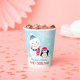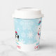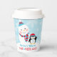 Winter wonderland "ONEderland" first birthday party paper cups design features a happy snowman and a cute little penguin with warm hats and a scarf and a wintery background with a pattern of snowflakes. Ice blue, turquoise, red, and white colours and custom text.