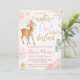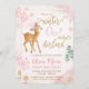 Celebrate your little one's 1st birthday with these ever-so-cute Winter Onederland-themed invitations! This colourful design features pink and gold pastel snowflakes, deer, and pine trees.