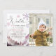 Modern girl's birthday party invitation card featuring watercolor art of the winter mountain with pine trees with snowflakes. The text says "Winter ONEDERLAND." Perfect for a girl's first birthday in the winter. Add a photo to this design.