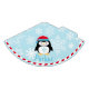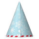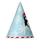 Winter wonderland "ONEderland" first birthday party hat design features a cute arctic penguin wearing a Santa hat with a number "1" / one on his tummy. Blue snowflake patterned background with red and white striped border. Ice blue, turquoise, red, black, and white colours. Personalise with your child's first name.