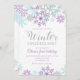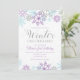 Winter Onederland first birthday invitation with purple, silver and blue snowflakes.