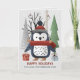 Winter penguin and trees Christmas photo folded Holiday Card. it showcases a penguin in winter clothes, trees, gifts and birds on the cover, a photo on the iside left and the same penguin with a house and your wishes on the inside right.