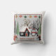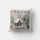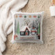 Winter penguin, Happy Holidays and snowflakes throw pillow. It features a penguin in winter clothes, a house, trees, gifts and ornaments.