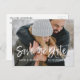 Winter Charcoal Grey Hand Lettered Script Save the Date Photo Card. The photo and text of this hand lettered brush script can be updated and customised with your photo and name. This card also displays your name on the back of the Save the Date Card.