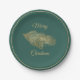 Elegant Kelly green coloured holiday paper plates with a gold tone ring edging and gold tone graphics of a pine cones and pine branch, in the middle. Merry Christmas in golden tan text is ready to personalise with your message.