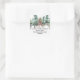 A festive snowy wintry pine forest Christmas sticker which also features a cozy home peaking out from behind the trees. The falling snow is represented by silver glitter. The sticker can be customized with the inclusion of your name(s).