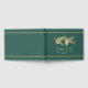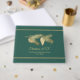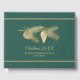 Elegant emerald green and gold tone holiday guest book, with graphics of golden pine cones and pine branch. Personalise the text fields for your holiday open house or Christmas party.