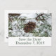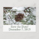 A pine cone, still on the branch, covered in freshly fallen snow. A beautiful, simple winter scene to feature your "save the date" message.
