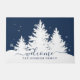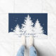 Winter doormat with white pine trees with snow against navy blue background. Script welcome and family name.