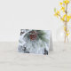 Blank note card with beautiful winter scene of a pine tree and pine cone covered in snow. Matching postage