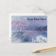 A watercolor landscape of a winter pond with surrounding foliage frosted with ice adorns this customisable postcard!